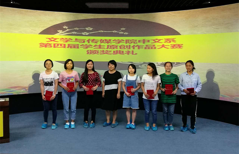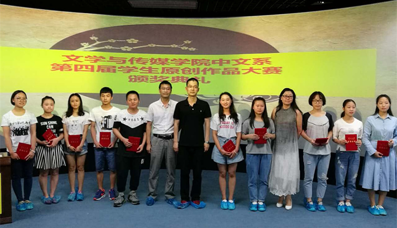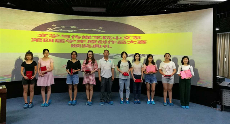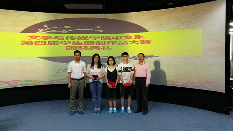 第四届原创作品大赛,中文系学生踊跃参赛,共收到参赛作品二百余件,大赛评委会共评出一等奖3名,二等奖6名,三等奖12名,优秀奖30名。典礼上,学院领导和老师依次为获奖同学颁发荣誉证书并合影留念。