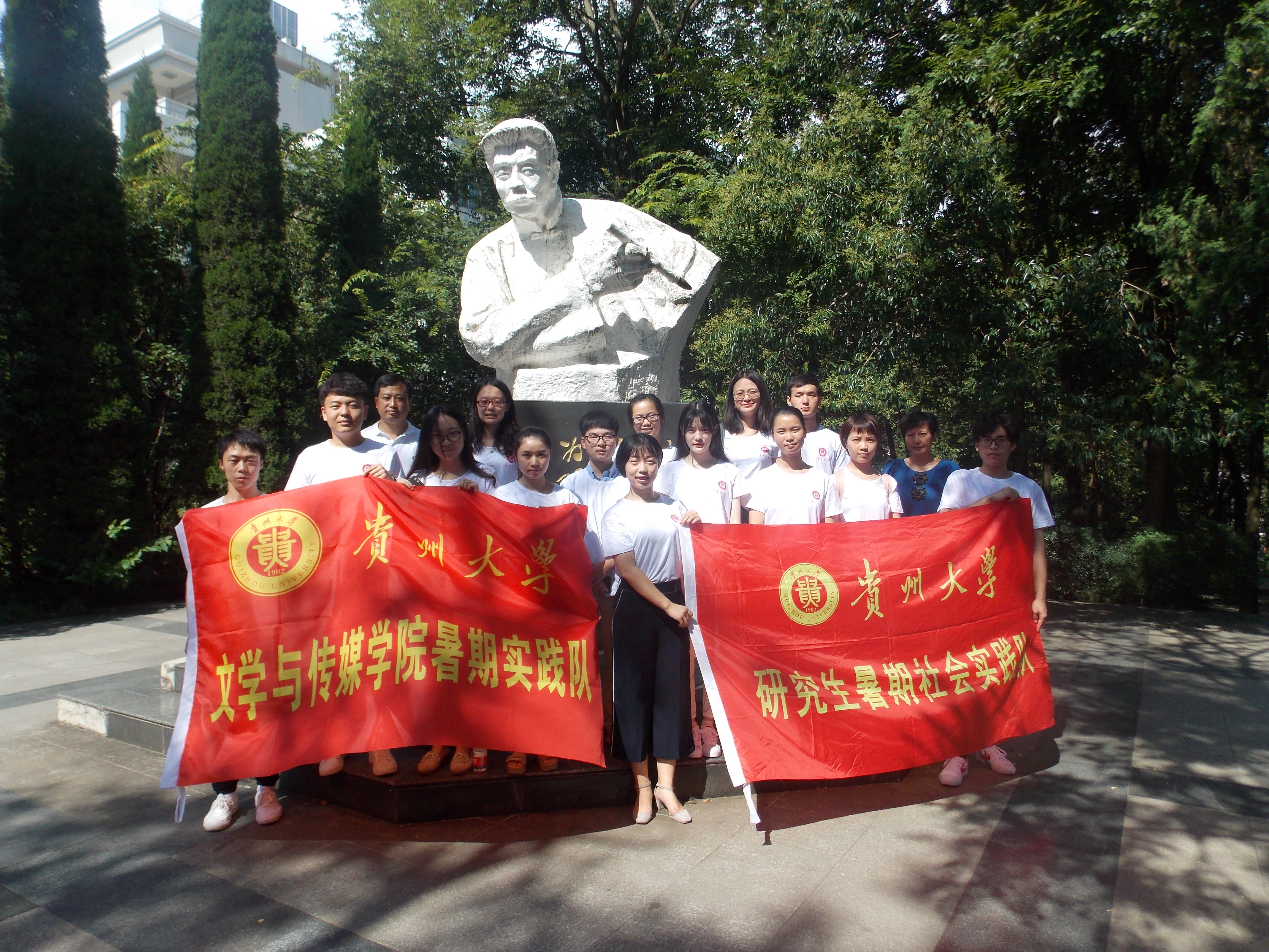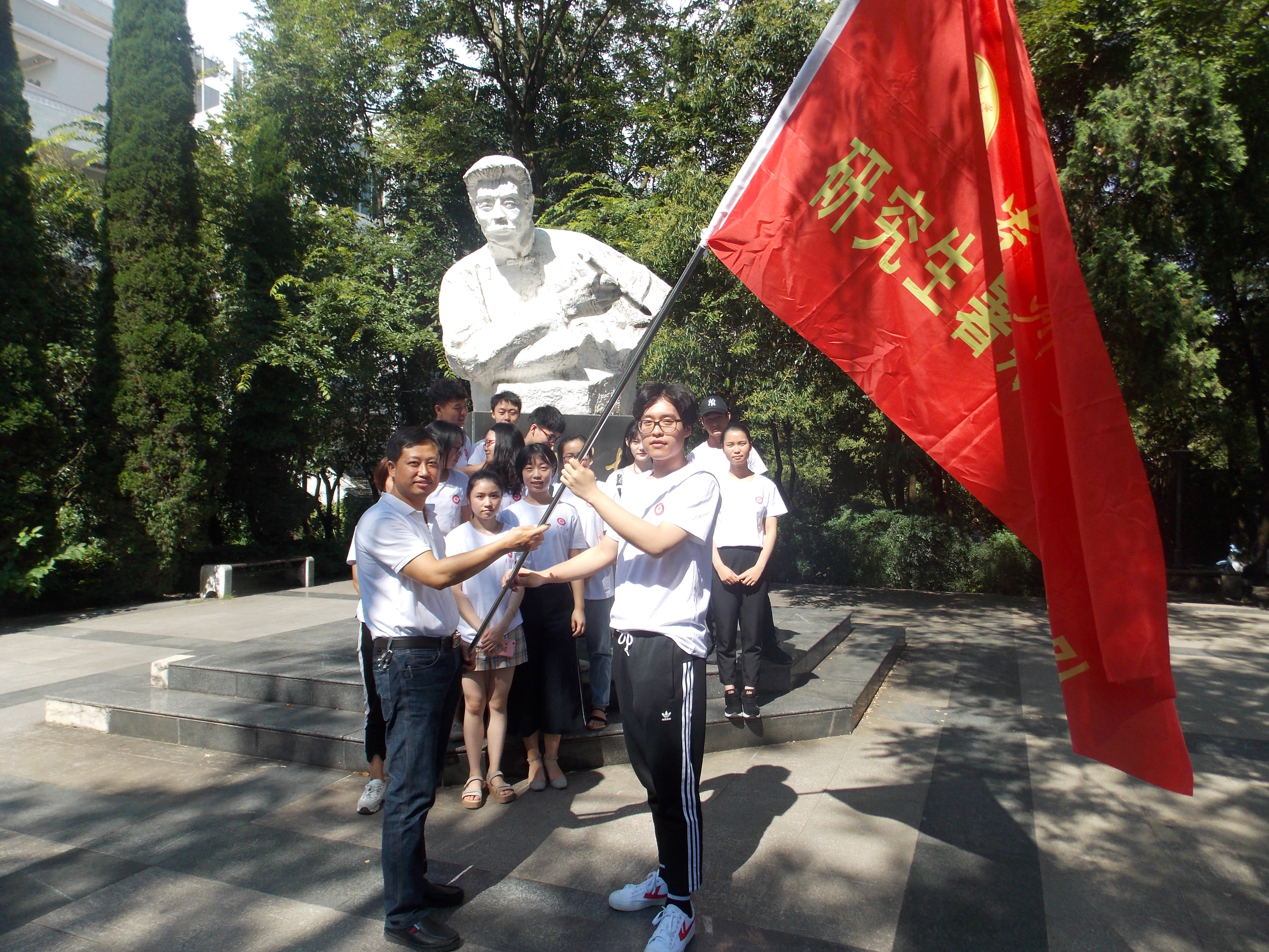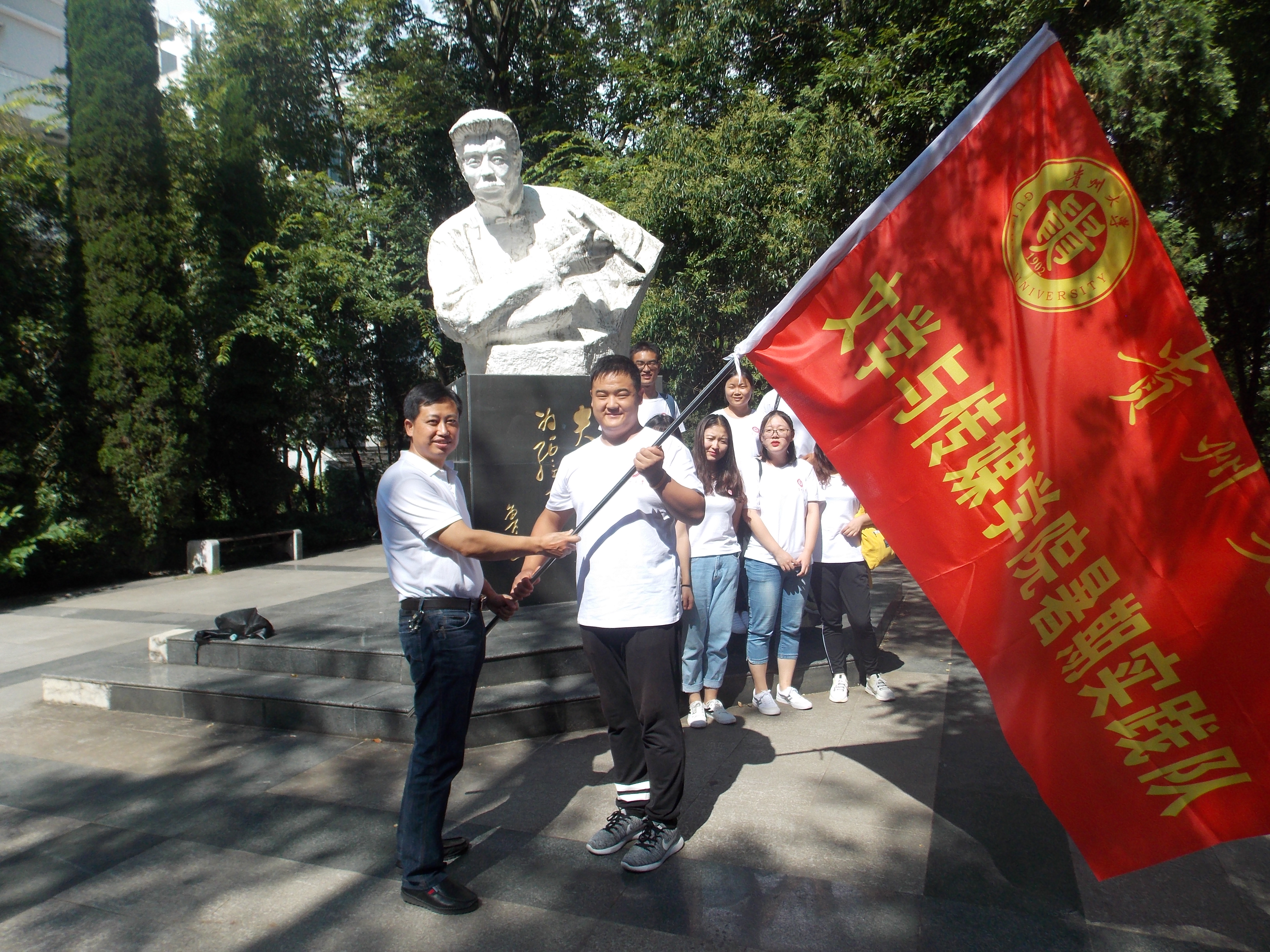 会议最后,与会人员来到逸夫楼鲁迅像前。学院党委书记罗卫刚分别向息烽自愿者代表队和从江实践队的队长授旗。