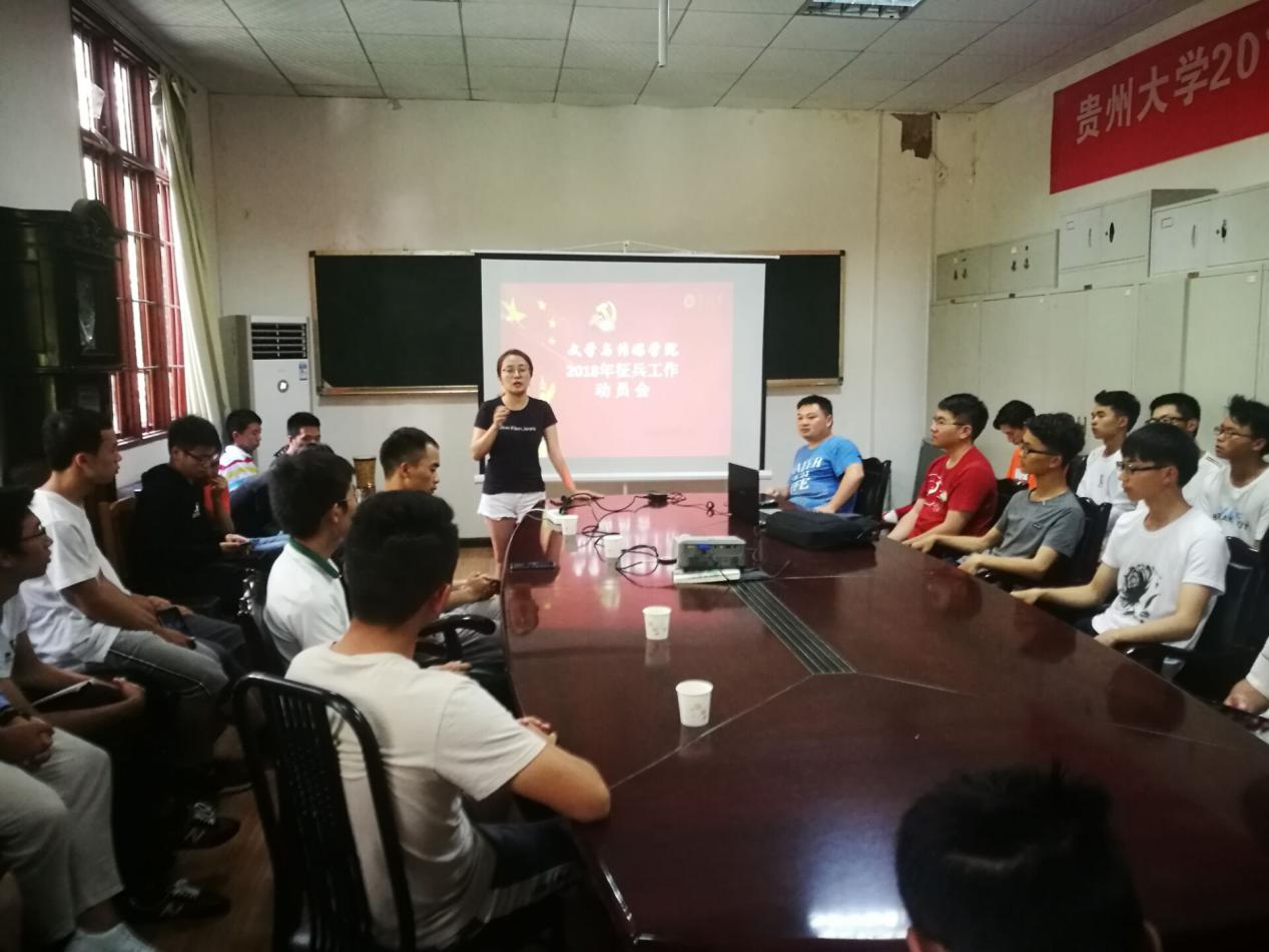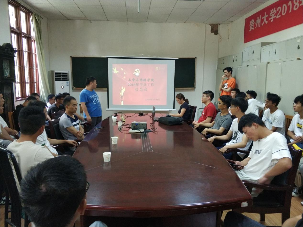 (文学与传媒学院 赵恒锋 摄影 报道)81日,贵州大学文学与传媒学院辅导员吴卿、王婷婷组织召开了“贵州大学文学与传媒学院2018年征兵工作动员会”,学院所有男同学参加会议。本次征兵工作动员会既旨在宣传大学生应征入伍各项政策,又在于鼓舞同学们携笔从戎,献身国防事业。