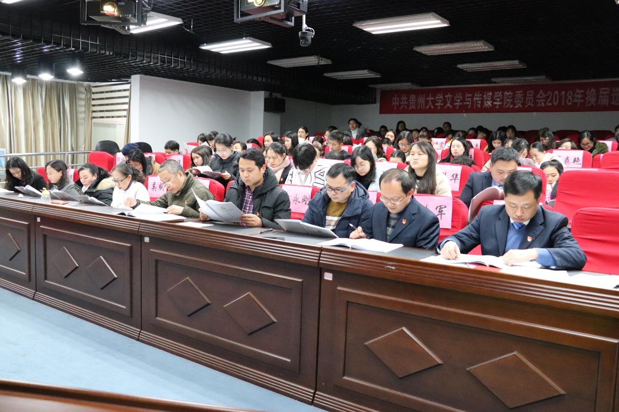 审议报告结束后,罗卫刚主持换届选举党员大会。选举之前,全体党员以举手表决方式通过了《中共贵州大学文学与传媒学院委员会2018年换届工作选举办法(草案)》,通过监票人、计票人名单。