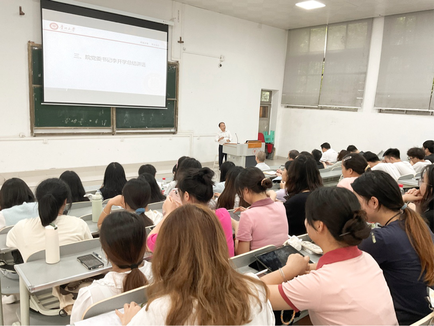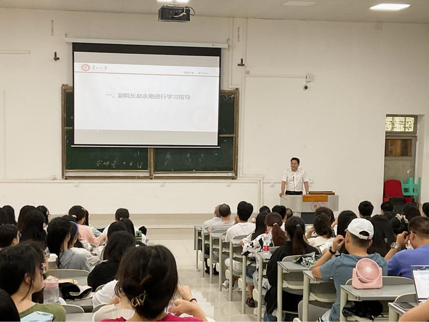 2023年8月21日下午,贵州大学半岛在线于法学楼101DT召开2020级本科生年级大会暨考研推进会。学院党委书记李开学、副书记院长谭德兴、副书记副院长赵永刚、教学科科长郭付利、本科生思政辅导员曹家鹏及全体2020级本科生参加本次会议。会议由辅导员曹家鹏主持。