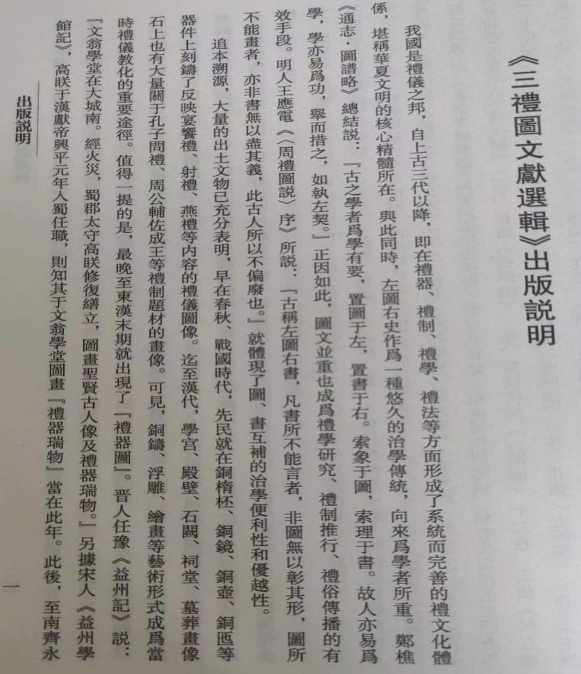 三礼图是礼学的重要内容,具有独特的形式和内涵。在礼学的发展中,为解说三礼中的器物和制度,产生大量的礼图,形成数量庞大的礼图文献。这些礼图文献对当代的经学、史学、哲学、文学研究有不可替代的价值。《三禮圖文獻選輯》主要选择重要三礼图文献中的珍本、善本,共计63种,包括元刻本《五服图解》、明萬曆四十四年修吉堂刻本(摹刻宋版)《六经图》、清康熙四十年宋氏刻本《四礼初稿》、清丁氏八千卷樓鈔本《礼学汇编》等珍贵古籍。《三礼图文献选辑》的影印出版,有助于相关学科的学者推进该领域的研究进度,开拓研究视野,深化研究理念,必将在礼学界、经学界、古文献学界产生深远影响。