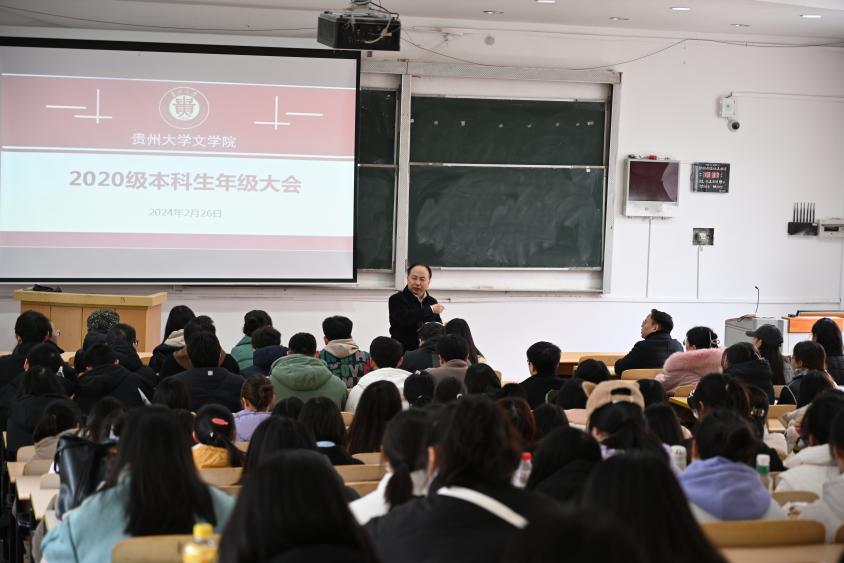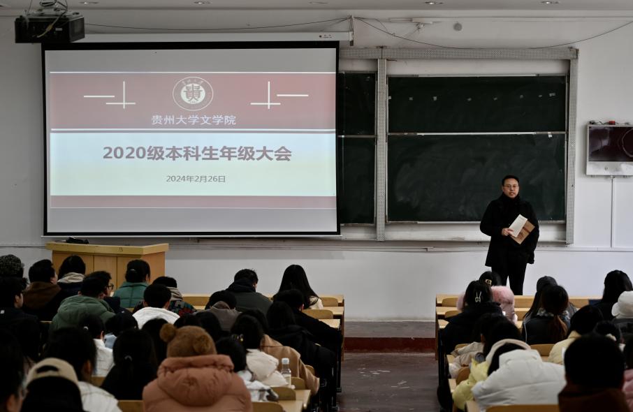 2024年2月26日中午,贵州大学半岛在线在逸夫楼515DT召开2020级本科生新学期年级大会。学院党委书记李开学、中文系教师彭兴滔、本科生思政辅导员曹家鹏及全体2020级本科生参加会议。会议由曹家鹏主持。