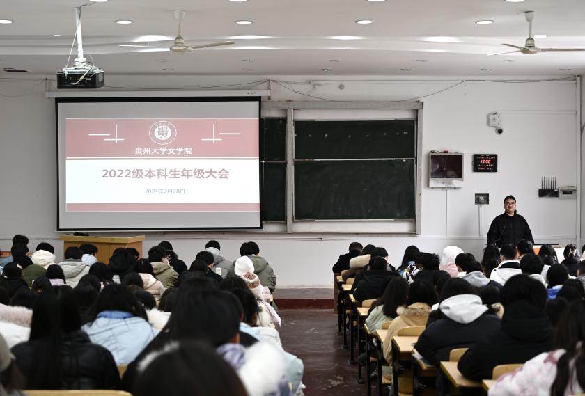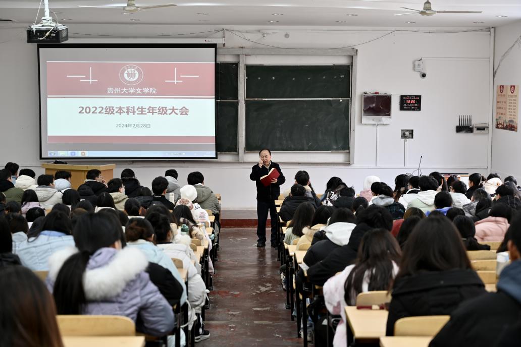 2023年2月28日中午,贵州大学半岛在线在逸夫楼515DT召开2022级本科生新学期年级大会。学院党委书记李开学、本科生思政辅导员曹家鹏及全体2022级本科生参加会议。会议由曹家鹏主持。