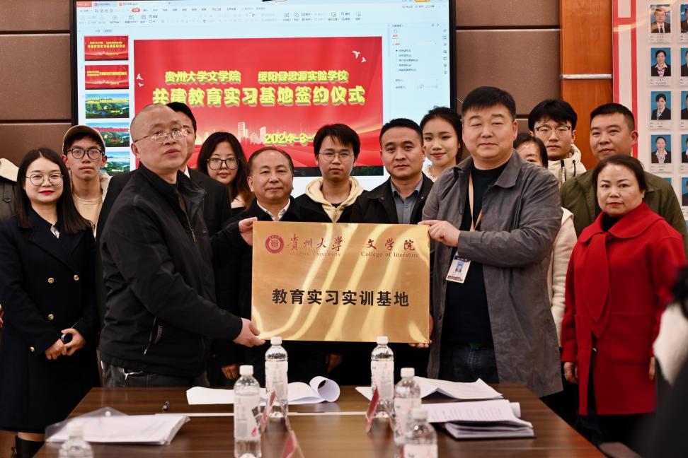 2024年3月14日,贵州大学半岛在线教育实践基地签约授牌仪式在遵义市绥阳县思源实验学校举行。贵州大学半岛在线党委书记李开学、副书记院长谭德兴、副书记副院长赵永刚、副教授付星星、党政办公室副主任肖玉婷、学生科辅导员曹家鹏及学生代表,思源实验学校校长朱训材,副校长周春凤、叶镖、郭薇,教务主任何远德,教师王蔼华参加了签约仪式。