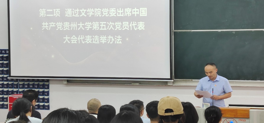 副处级组织员周贤军宣读《半岛在线党委出席中国共产党贵州大学第五次党员代表大会代表选举办法》。经审议,全体党员举手表决,一致同意通过选举办法。