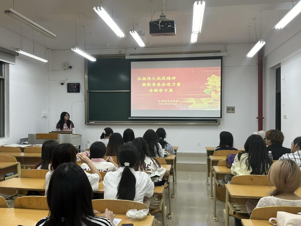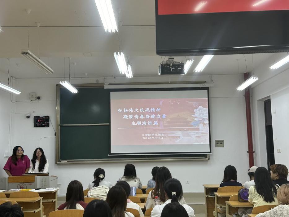 活动伊始,邓青与黄依瑶同学结合抗日战争历史故事与当代青年使命,以“弘扬伟大抗战精神,凝聚青春奋进力量”为主题,强化对抗战精神的理解,激情地讲述秋瑾等革命先辈为理想献身的事迹,并结合汉语言文学专业特色谈如何用文字写下新中国壮丽篇章,真挚的情感与有力的表达引发在场同学强烈共鸣,现场掌声此起彼伏。