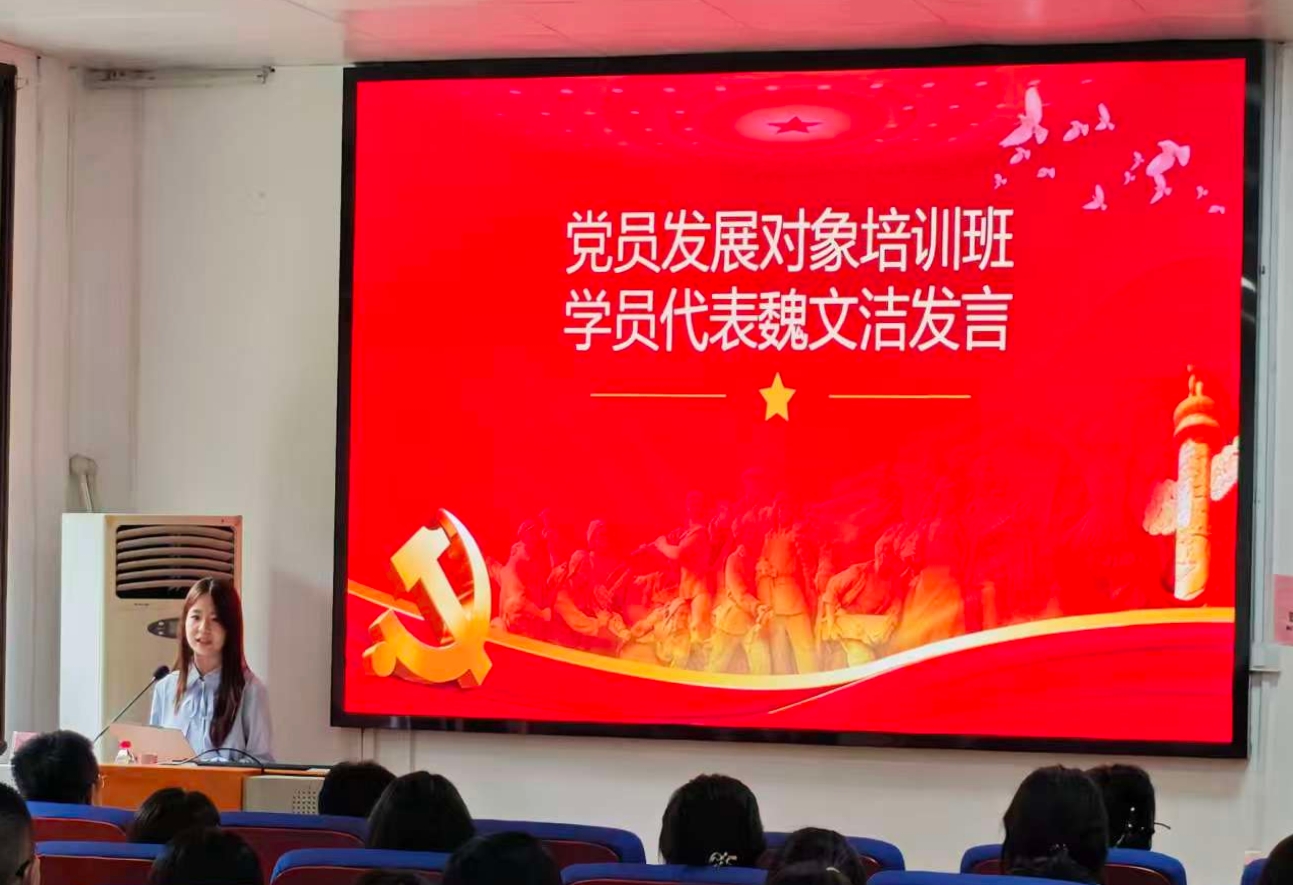 党员发展对象学员代表魏文洁同学在发言中表示,在今后的学习与生活中,将以党员的标准严格要求自己,加强党的理论学习和方针政策领悟,切实提升自身政治素养,把为人民服务的初心从信念转化为行动,用实干诠释青年担当。