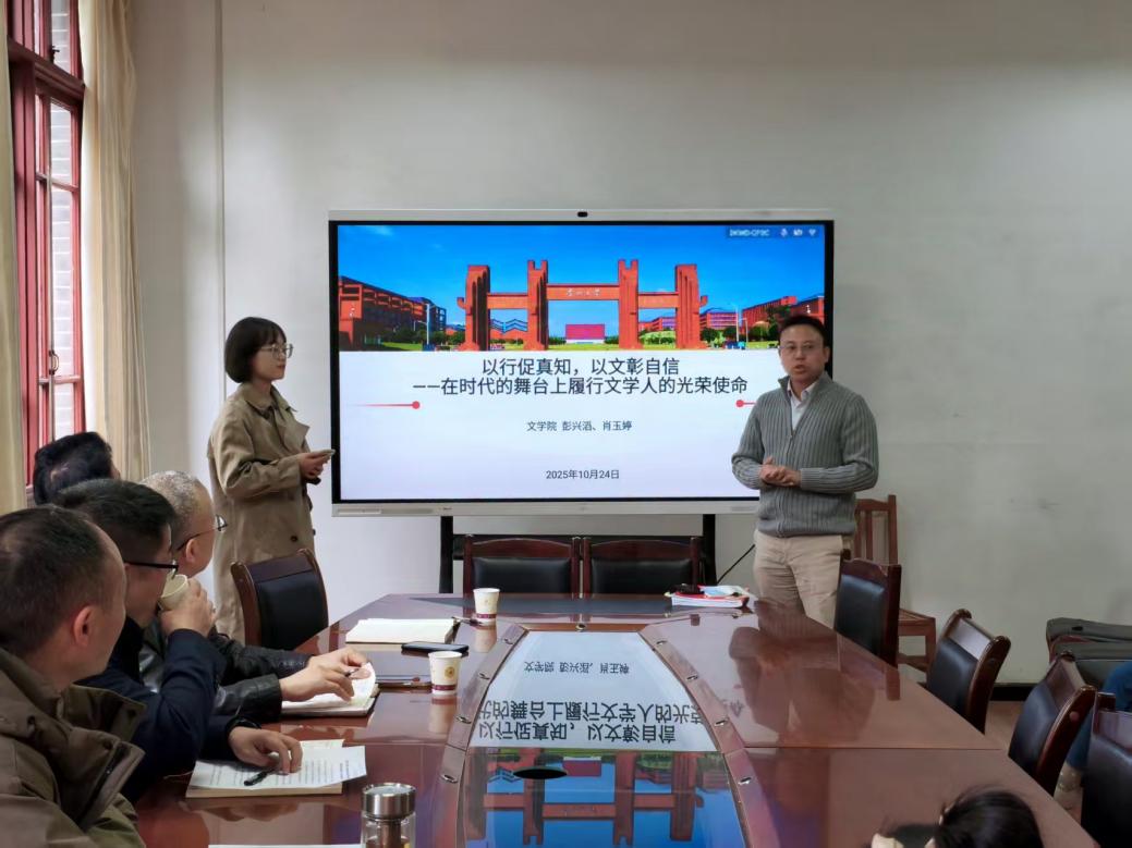 为深入学习贯彻习近平新时代中国特色社会主义思想,推动文化育人、实践育人走深走实。2025年10月24日中午,半岛在线举办“以行促真知,以文彰自信——在时代的舞台上履行文学人的光荣使命”理论宣传二人讲活动。本次活动由教工党支部书记彭兴滔、党政办公室副主任肖玉婷两位老师主讲,围绕新时代文学人的使命担当,系统阐述了半岛在线在人才培养、文化传承与服务社会方面的探索与实践。