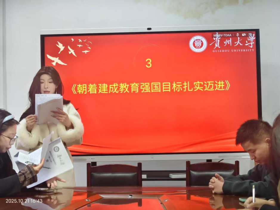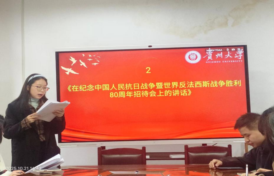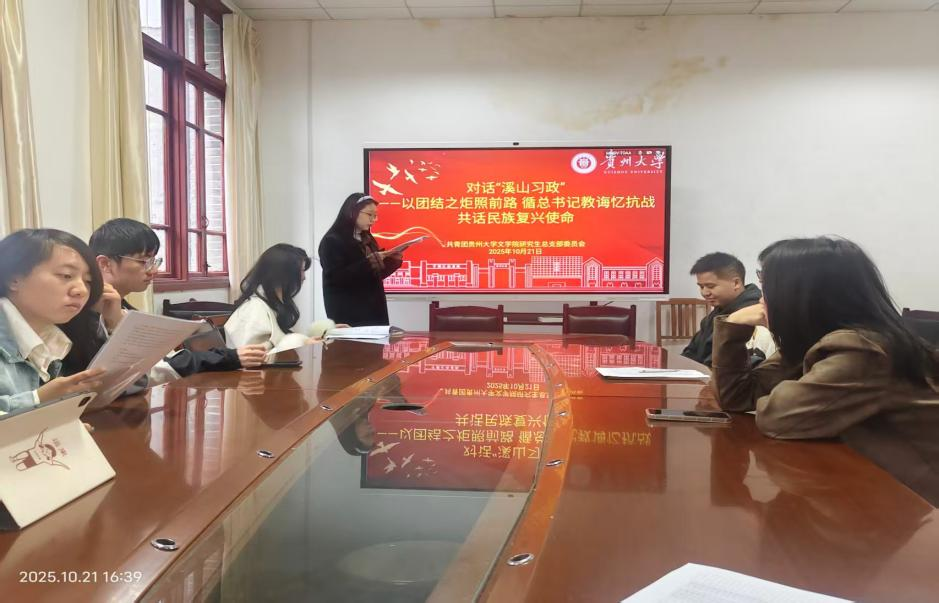 2025年10月21日,共青团贵州大学半岛在线研究生总支部委员会在人文楼204教室组织开展“以团结之炬照前路 循总书记教诲忆抗战 共话民族复兴使命”主题溪山习政理论学习活动。2025级全体研究生参加此次学习,会议由半岛在线研究生团总支书记贺诗洋主持。