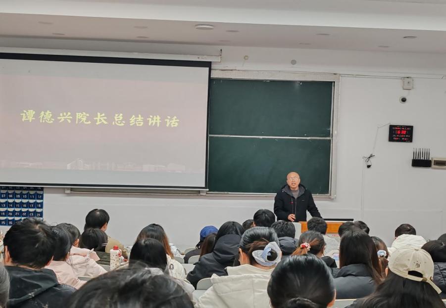谭德兴作总结讲话。他肯定了学子们备考以来的坚持与付出,叮嘱大家在最后阶段要劳逸结合,保持积极心态,以自信从容的状态迎接考试。同时,他表示学院永远是学子们最坚实的后盾,备考路上遇到困难,可随时向老师们求助。